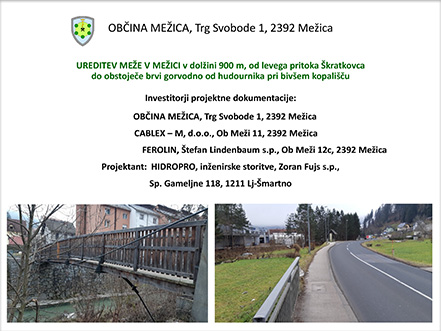 Aprila 2024 so v občini Mežica uspešno zaključili protipoplavne ukrepe ob reki Meži in na izlivnih odsekih njenih pritokov znotraj naselja. Namen projekta je zmanjšati poplavno ogroženost območja pomembnega vpliva poplav (OPVP) Mežica.